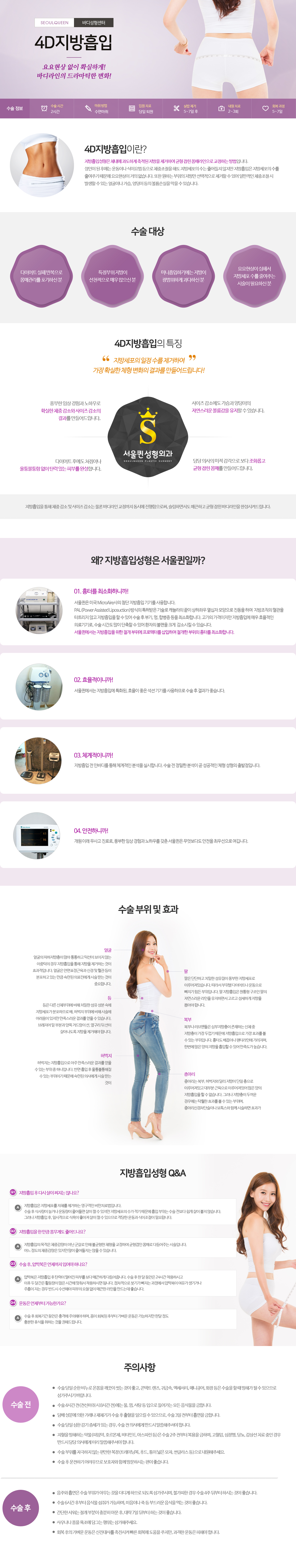 지방세포의 일정 수를 제거하여 가장 확실한 체형 변화의 결과를 만들어드립니다. 풍부한 임상 경험과 노하우로 확실한 체중 감소와 사이즈 감소의 결과를 만들어드립니다. 사이즈 감소에도 엉덩이의 자연스러운 볼륩감을 유지할 수 있습니다. 다이어트 후에도 처짐이나 울퉁불퉁함 없이 탄력 있는 피부를 완성합니다. 담당 의사의 미적 감각으로 보다 조화롭고 균형 잡힌 몸매를 만들어드립니다. 지방 흡임을 통해 체중 감소 및 사이즈 감소는 물론 바디라인 교정까지 동시에 진행함으로써, 슬림하면서도 매끈하고 균형 잡힌 바디라인을 완성시켜드립니다.