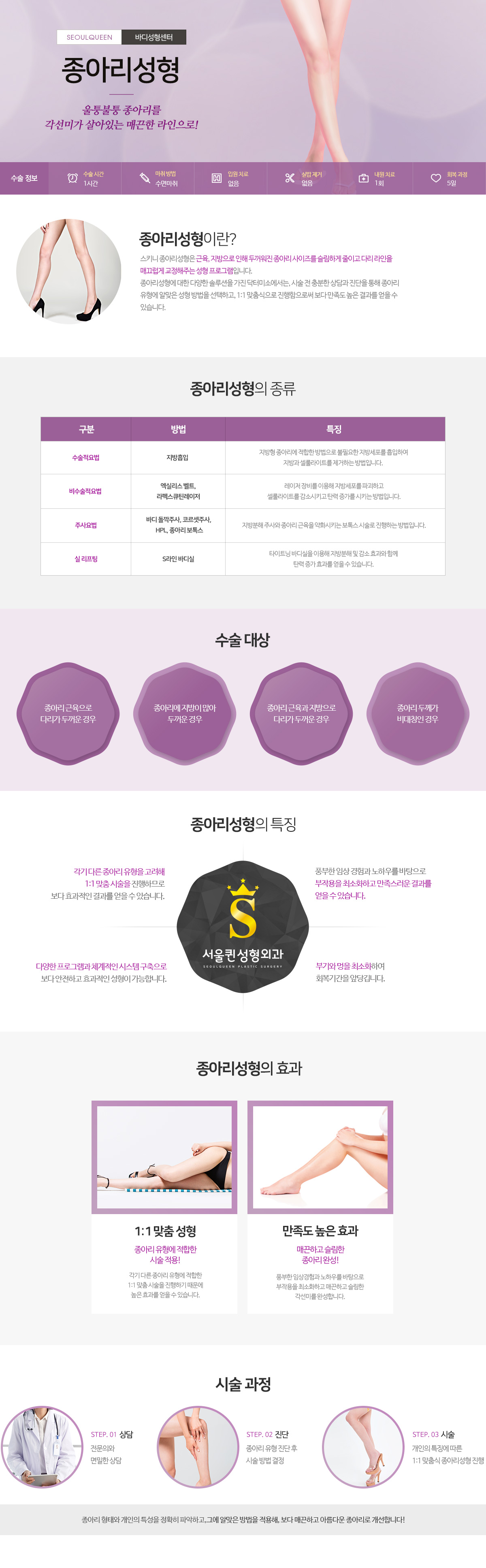 종이라 형태와 개인의 특성을 정확히 파악하고,, 그에 알맞은 방법을 적용해, 보다 매끈하고 아름다운 종아리로 개선합니다.