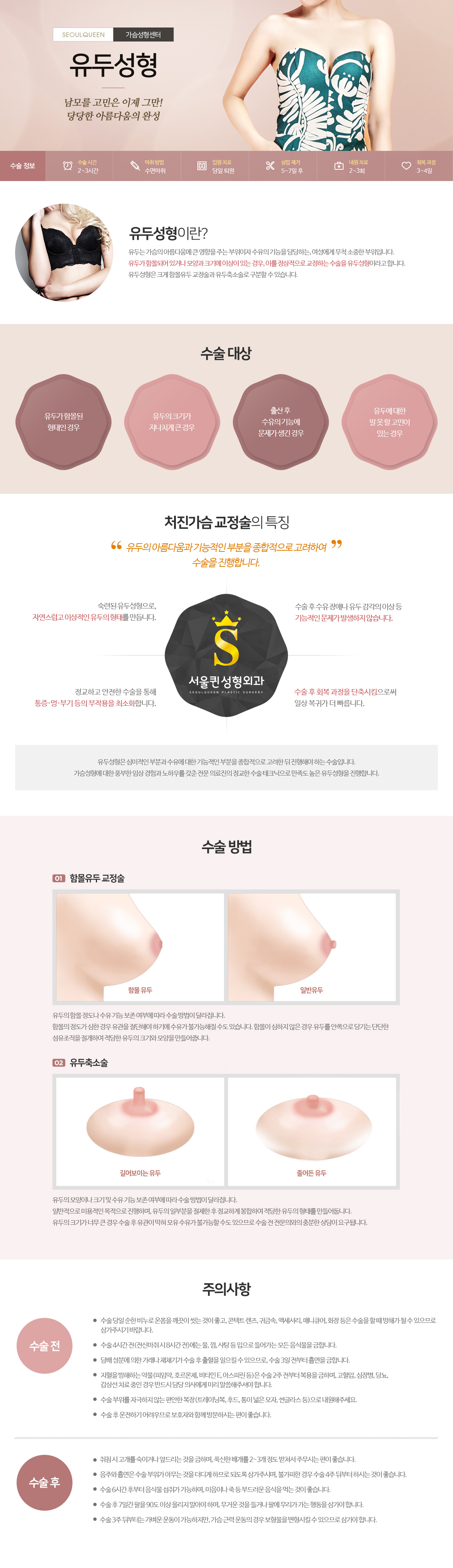 특징: 유두의 아름다움과 기능적인 부분을 종합적으로 고려하여 수술을 진행합니다. 숙련된 유두성형으로, 자연스럽고 이상적인 유두의 형태를 만듭니다. 수술 후 수유 장애나 감각의 이상 등 기능적인 문제 발생하지 않습니다. 정교하고 안전한 수술을 통해 통증, 멍, 부기, 등의 부작용을 최소화합니다. 수술 후 회복 과정을 단축시킴으로써 일상 복귀가 더 빠릅니다. 유두 성형은 심미적인 부분과 수유에 대해 기능적인 부분을 종합적으로 고려한 뒤 진행해야 하는 수술입니다. 가슴 성형에 대한 풍부한 임상 경험과 노하우를 갖춘 전문 의료진의 정교한 수술 테크닉으로 만족도 높은 유두 성형을 진행합니다.