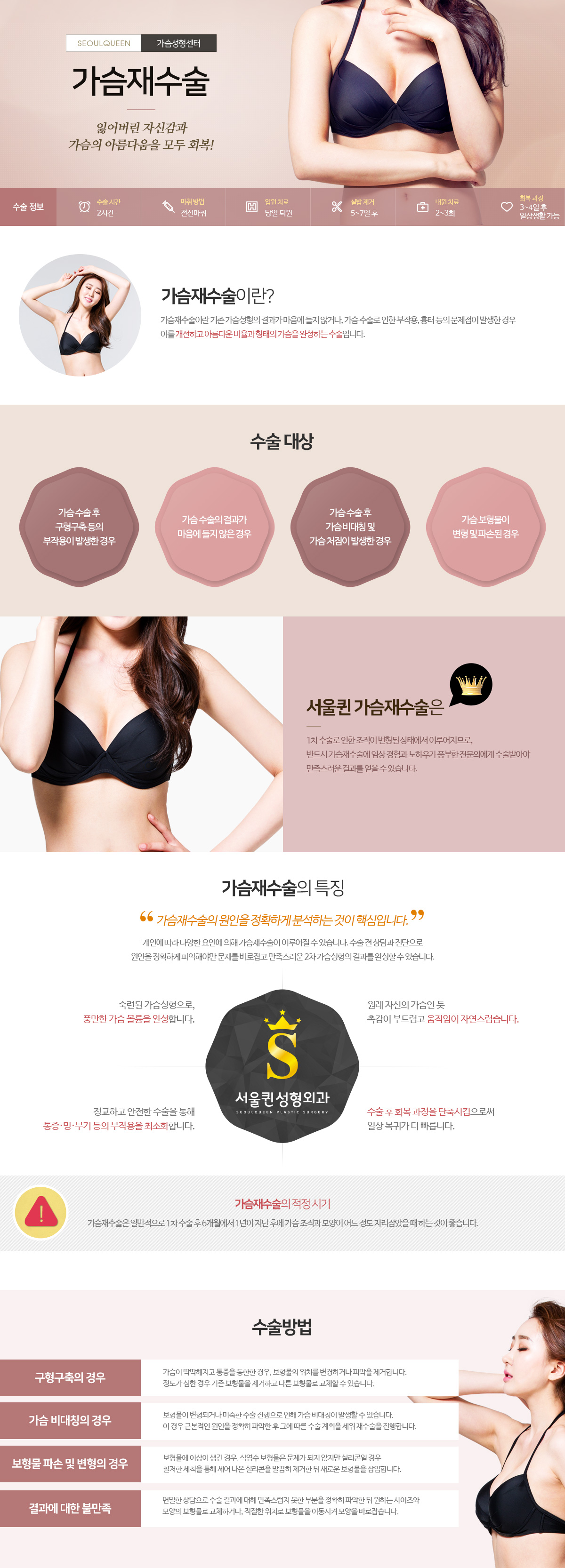 서울퀸 가슴재수술은 1차 수술로 인한 조직이 변형된 상태에서 이루어지므로, 반드시 가슴재수술에 임상 경험과 노하우가 풍부한 전문의에게 수술 받아야 만족스러운 결과를 얻을 수 있습니다.