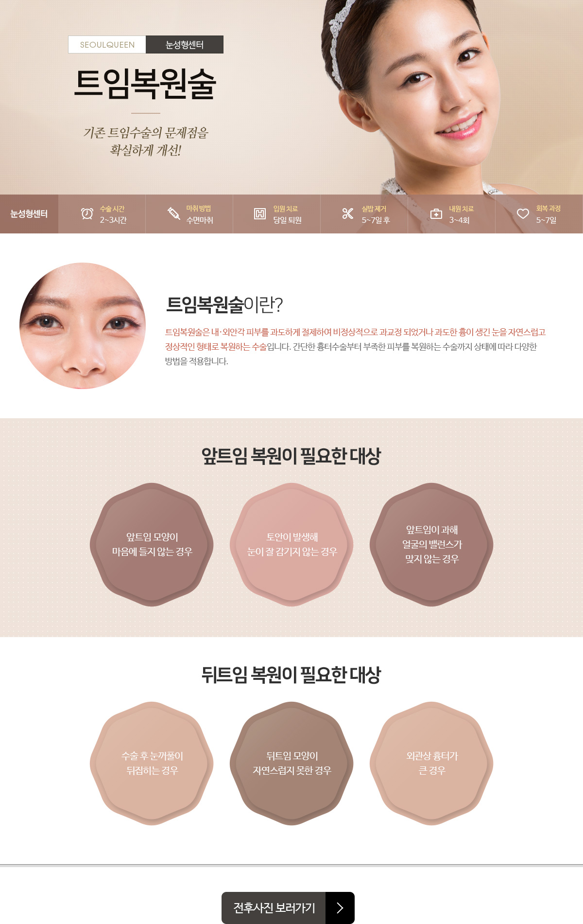 뒤트임 복원이 필요한 대상: 수술 후 눈꺼풀이 뒤집히는 경우, 뒤트임 모양이 자연스럽지 못한 경우,외관상 흉터가 큰 경우.