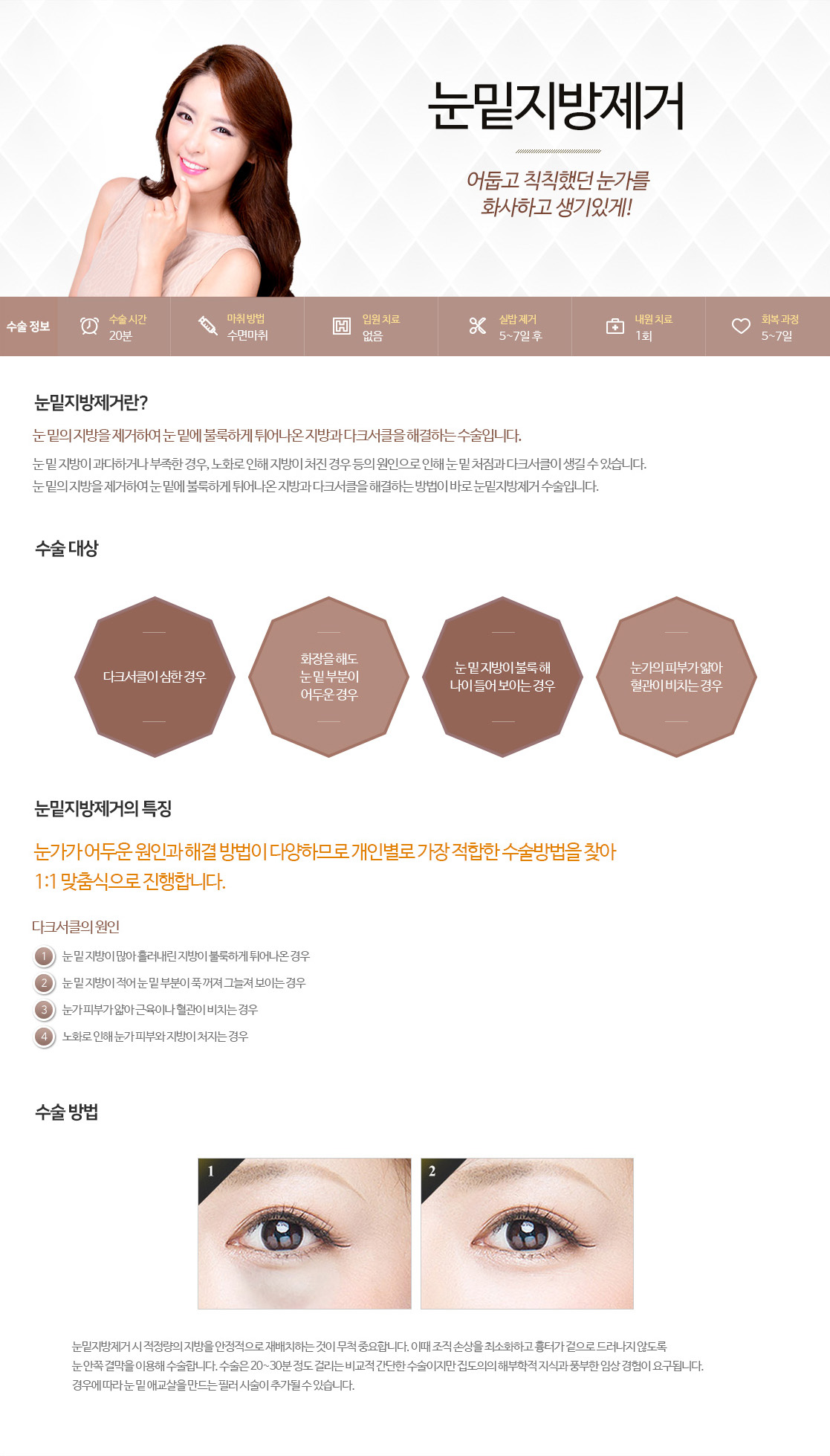 수술 대상: 다크서클이 심한 경우; 화장을 해도 눈 밑 부분이 어두운 경우, 눈 밑 지방이 불룩해 아니 들어 보이는 경우; 눈가의 피부가 얇아 혈관이 비치는 경우