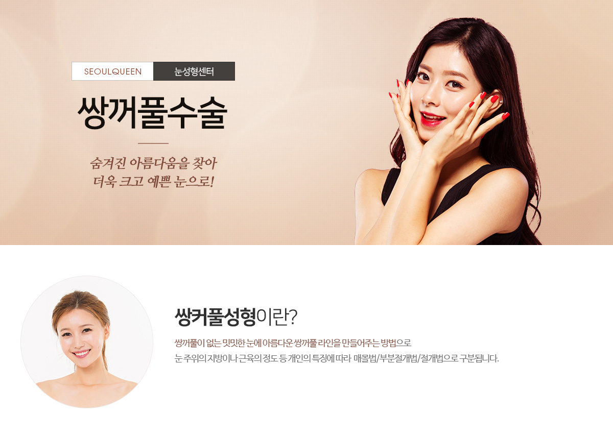 쌍꺼풀 수술 숨겨진 아름다움을 찾아 더욱 코고 예쁜 눈으로! 쌍꺼풀이 없는 밋밋한 눈에 아름다운 쌍꺼풀 라인을 만들어주는 방법으로 눈 주위의 지방이나 근육의 정도 등 개인의 특징에 따라 매몰법/부분절개법/절개법으로 구분됩니다.