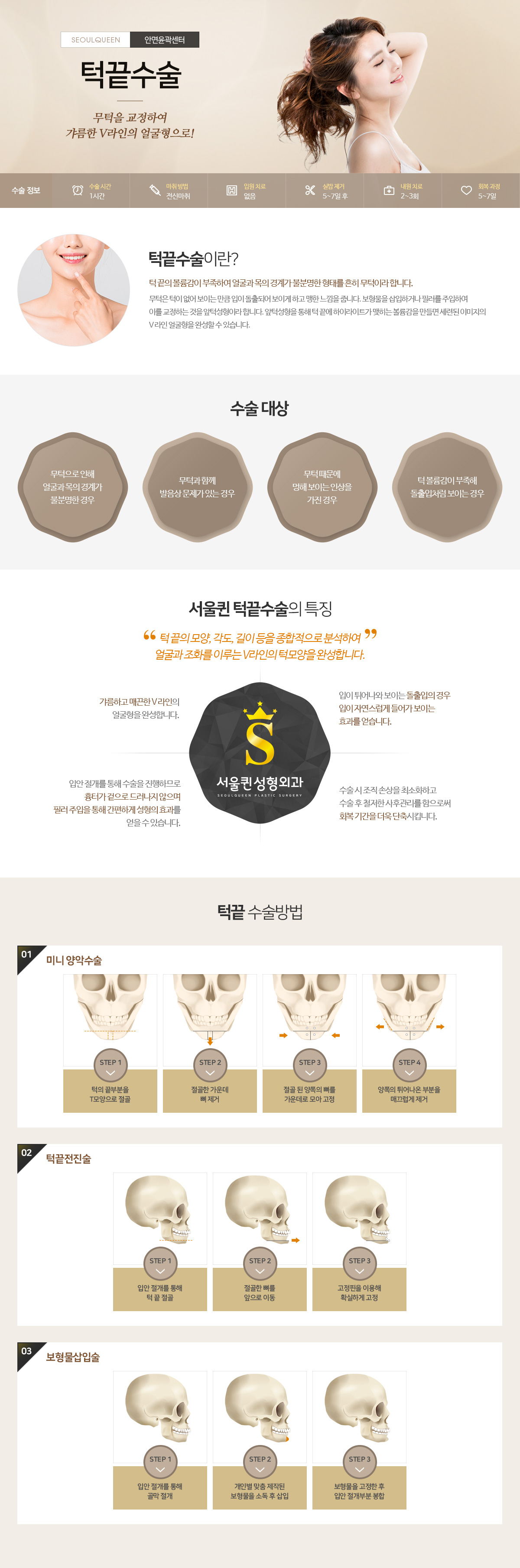 턱 끝 수술이란? 턱 끝의 볼륨감이 부족하여 얼굴과 목의 경계가 불분명한형태를 흔히 무턱이라고 합니다. 무턱을 턱이 없어 보이는 만큼 입이 돌출되어 보이게 하고 맹한 느낌을 줍니다. 보형물을 삽입하거나 필러를 주입하여 이를 교정하는 것을 앞턱성형이라고 합니다. 앞턱성형을 통해 턱 끝에 하이라이트가 맺히는 볼륨감을 만들면 세련된 이미지의 V라인 얼굴형을 완성할 수 있습니다.