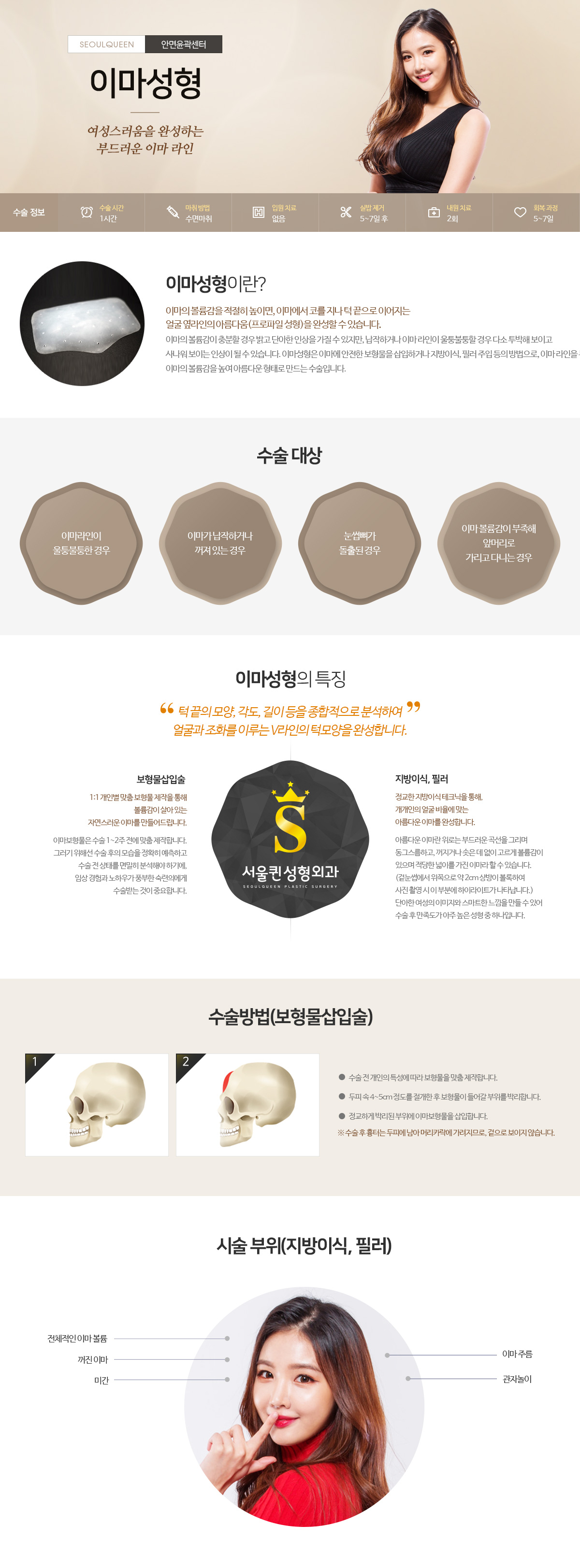 지방 이식, 필러: 정교한 지방이식 테크닉을 통해, 개개인의 얼굴 비율에 맞는 아름다운 이마를 완성합니다. 아름다운 이마란 위로는 부드러운 곡선을 그리며 동그스름하고, 꺼지거나 솟은 게 없이 고르게 볼륨감이 있으며 적당한 넓이를 가진 이마라 할 수 있습니다. (겉눈썹에서 위쪽으로 약 2cm 상방이 볼록하여 사진 촬영 시 이 부분에 하이라이트가 나타납니다.) 단아한 여성의 이미지와 스마트한 느낌을 만들 수 있어 수술 후 만족도가 아주 높은 성형 중 하나입니다.