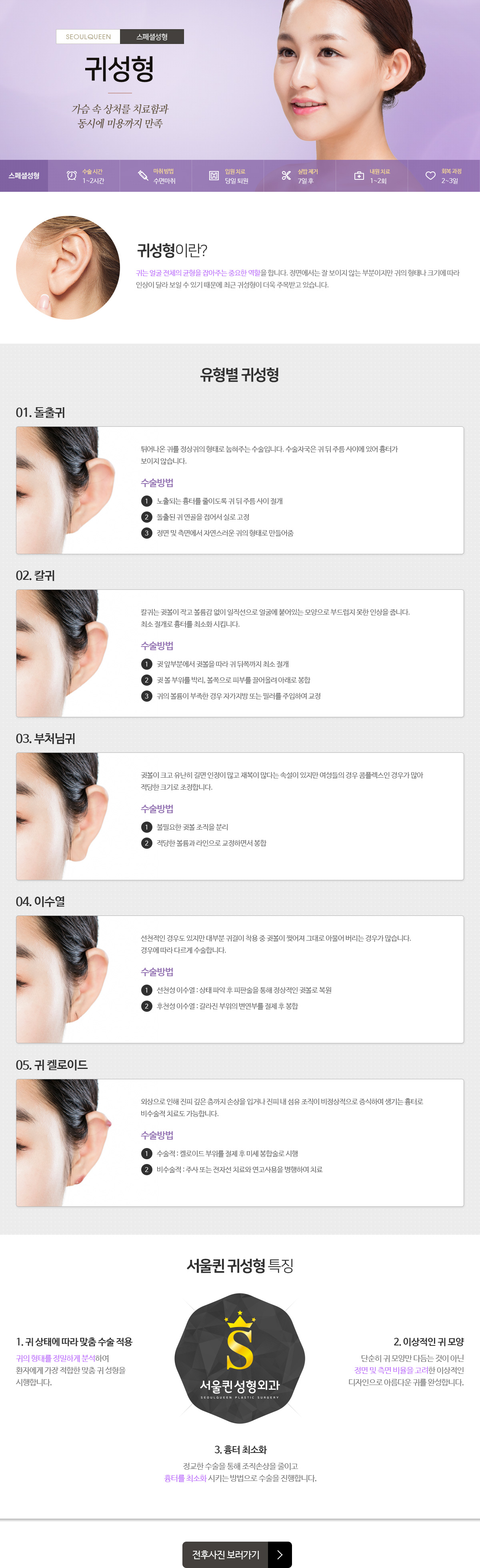 귀성형 가슴 속 상처를 치료함과 동시에 미용까지 만족 귀는 얼굴 전체의 균형을 잡아주는 중요한 역할을 합니다. 정면에서는 잘 보이지 않는 부분이지만 귀의 형태나 크기에 따라 인상이 달라 보일 수 있기 때문에 최근 귀 성형이 더욱 주목 받고 있습니다. 유형별 귀성형 돌출귀: 튀어나온 귀를 정상귀의 형태로 눕혀주는 수술입니다. 수술자국은 귀 뒤 주름 사이에 있어 흉터가 보이지 않습니다. 수술 방법은 노출되는 흉터를 줄이도록 귀 뒤 주름 사이 절개; 돌출된 귀 연골을 접어서 실로 고정; 정면 및 측면에서 자연스러운 귀의 형태로 만들어줌. 칼귀: 칼귀는 귓볼이 작고 볼륨감 없이 일직선으로 얼굴에 붙어 있는 모양으로 부드럽지 못한 인생을 줍니다. 수술 방법은 귀 앞부분에서 귓볼을 따라 귀 뒤쪽까지 최소 절개; 귓볼 부위를 박리, 볼쪽으로 피부를 끌어올려 아래로 봉합; 귀의 볼룸이 부족한 경우 자가지방 또는 필러를 주입하여 교정. 부처님귀: 귓볼이 크고 유난리 길면 인정이 많고 재복이 많다는 속설이 있지만 여성들의 경우 콤플렉스인 경우가 많아 적당한 크기로 조정합니다. 수술 방법은 불필요한 귓볼 조직을 분리; 적당한 볼륨과 라인으로 교정하면서 봉합. 이수열: 산천적인 경우도 있지만 대부분 귀걸이 착용 중 귓볼이 찢어져 그대로 아물어 벌이는 경우가 많습니다. 경우에 따라 다르게 수술합니다. 수술방법은 선천성 이수열은 상태 파악 후 피판수술을 통해 정상적인 귓볼로 복원. 후천성 이수열: 갈라진 부위의 변연부를 절제 후 봉합. 귀 칼로이드: 외상으로 인해 진피 깊은 층까지 손상을 입거나 진피 내 섬유 조직이 비정상적으로 증식하여 생기는 흉터로 비수술적 치료도 가능합니다. 수술 방법은 수술 전은 켈로이드 부위를 절제 후 미세 봉합술로 시행. 비수술적은 주사 또는 전자선 치료와 연고사용을 병행하여 치료. 서울퀸 쉬성형 특징: 귀 상태에 따라 맞춤 수술 적용: 귀의 형태를 정밀하게 분석하여 환자에게 가장 적합한 맞춤 귀 성형을 시행합니다. 이상적인 귀 모양: 단순히 귀 모양만 다듬는 것이 아닌 정면 및 측면 비율을 고려한 이상적인 디자인으로 아름다운 귀를 완성합니다. 흉터 최소화: 정교한 수술을 통해 조직손상을 줄이고 흉터를 최소화시키는 방법으로 수술을 진행합니다.